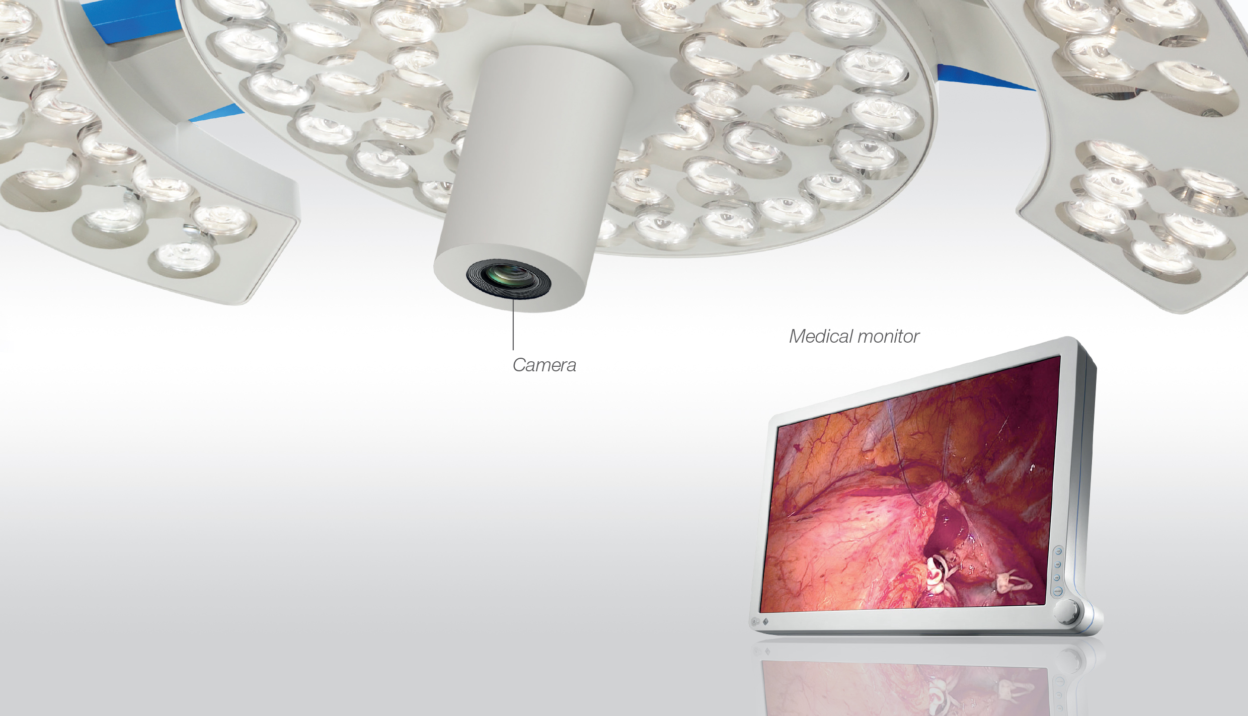 Adjustable endo light function reduces eye fatigue in case of endoscopic procedures and reflections on the monitors.