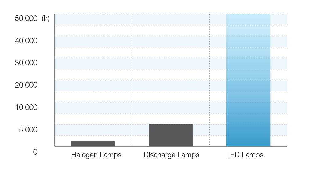 Long lifetime of LED technology light sources, estimated at over 50,000 hours, several times exceeds conventional light sources. There is no frequent replacement of the light sources, significantly reducing maintenance and replacement costs.